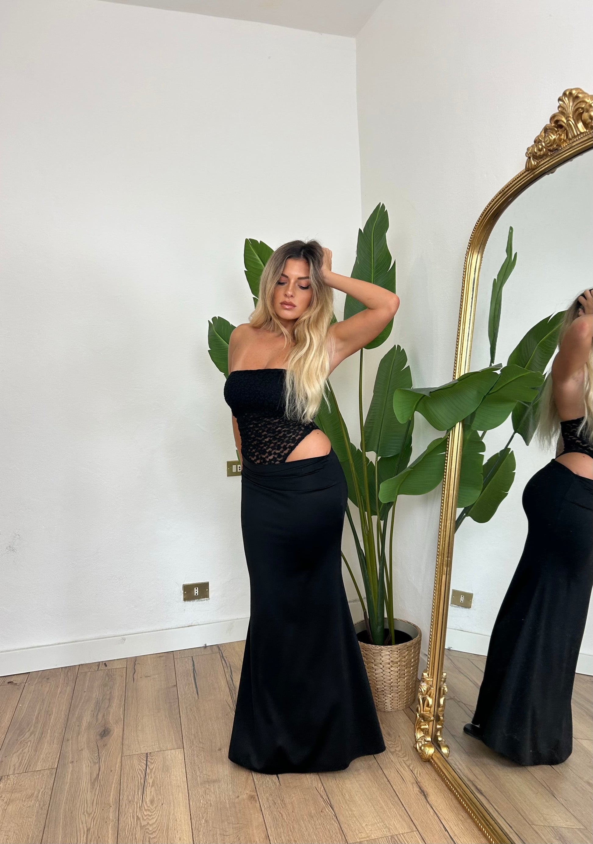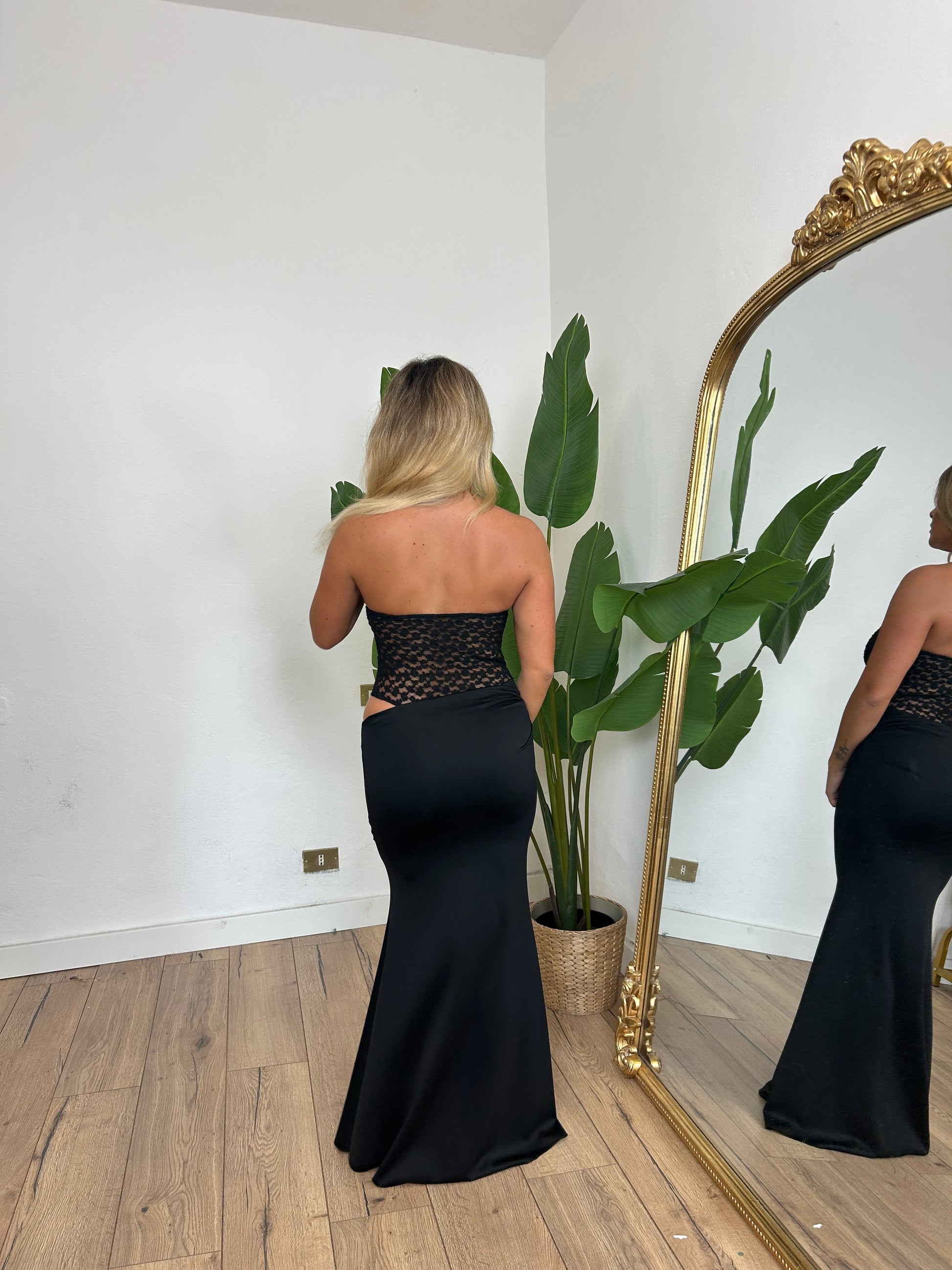 Abito lungo a fascia con parte superiore in pizzo