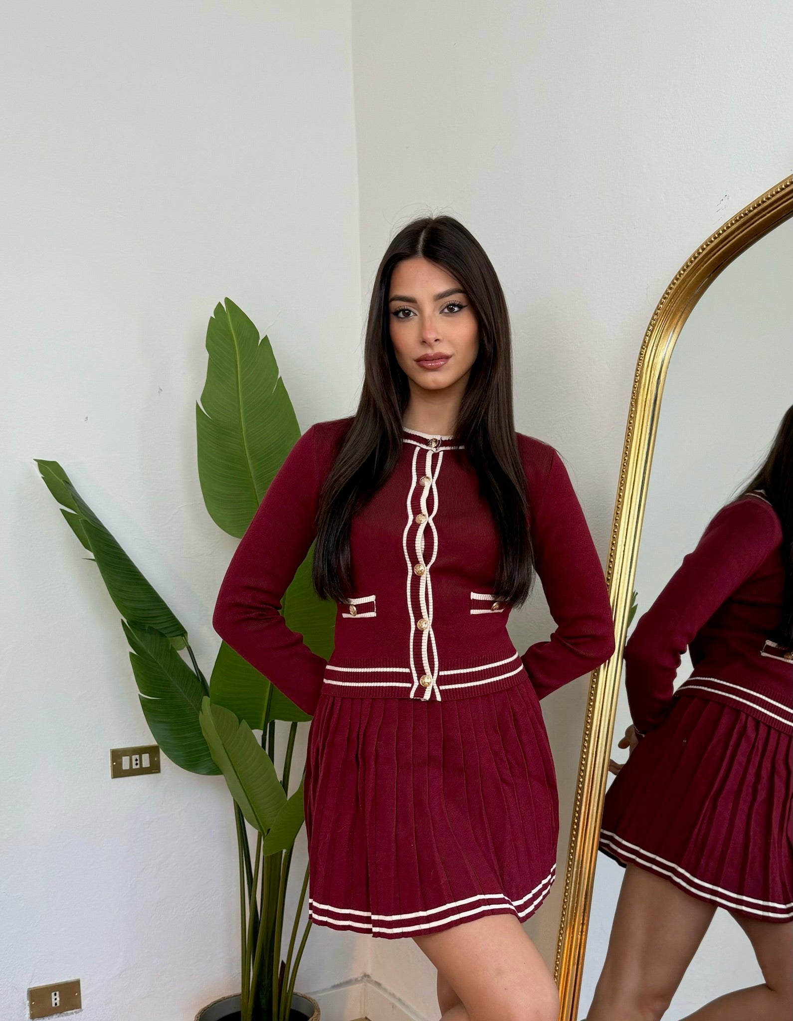 Coordinato formato da gonna e cardigan in maglia bordeaux con rifiniture bianche
