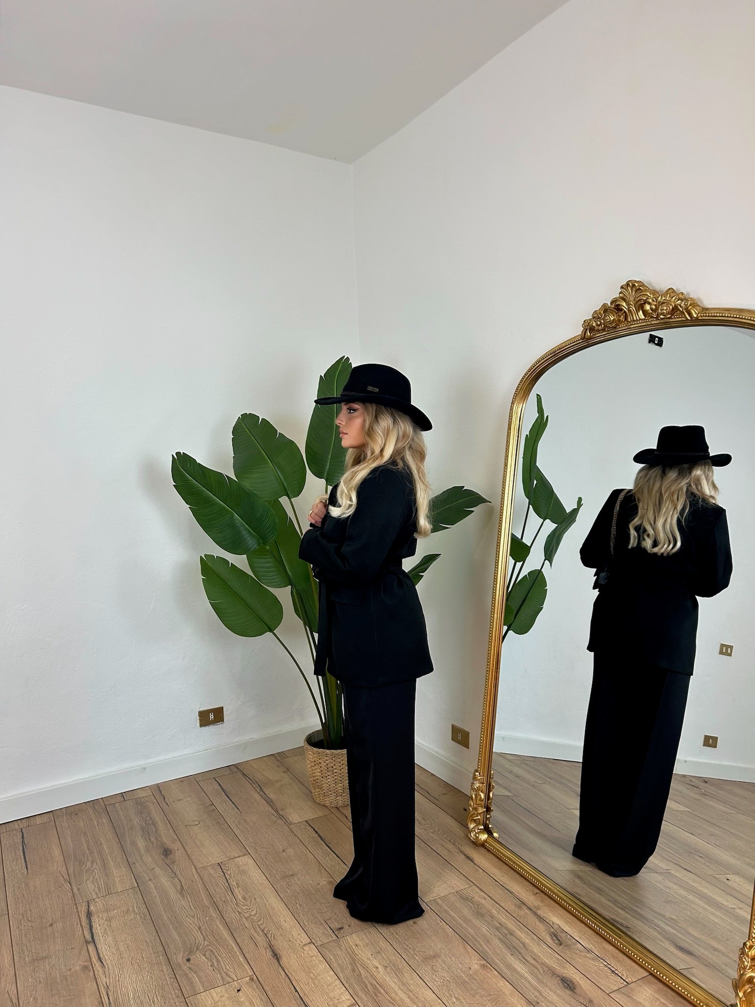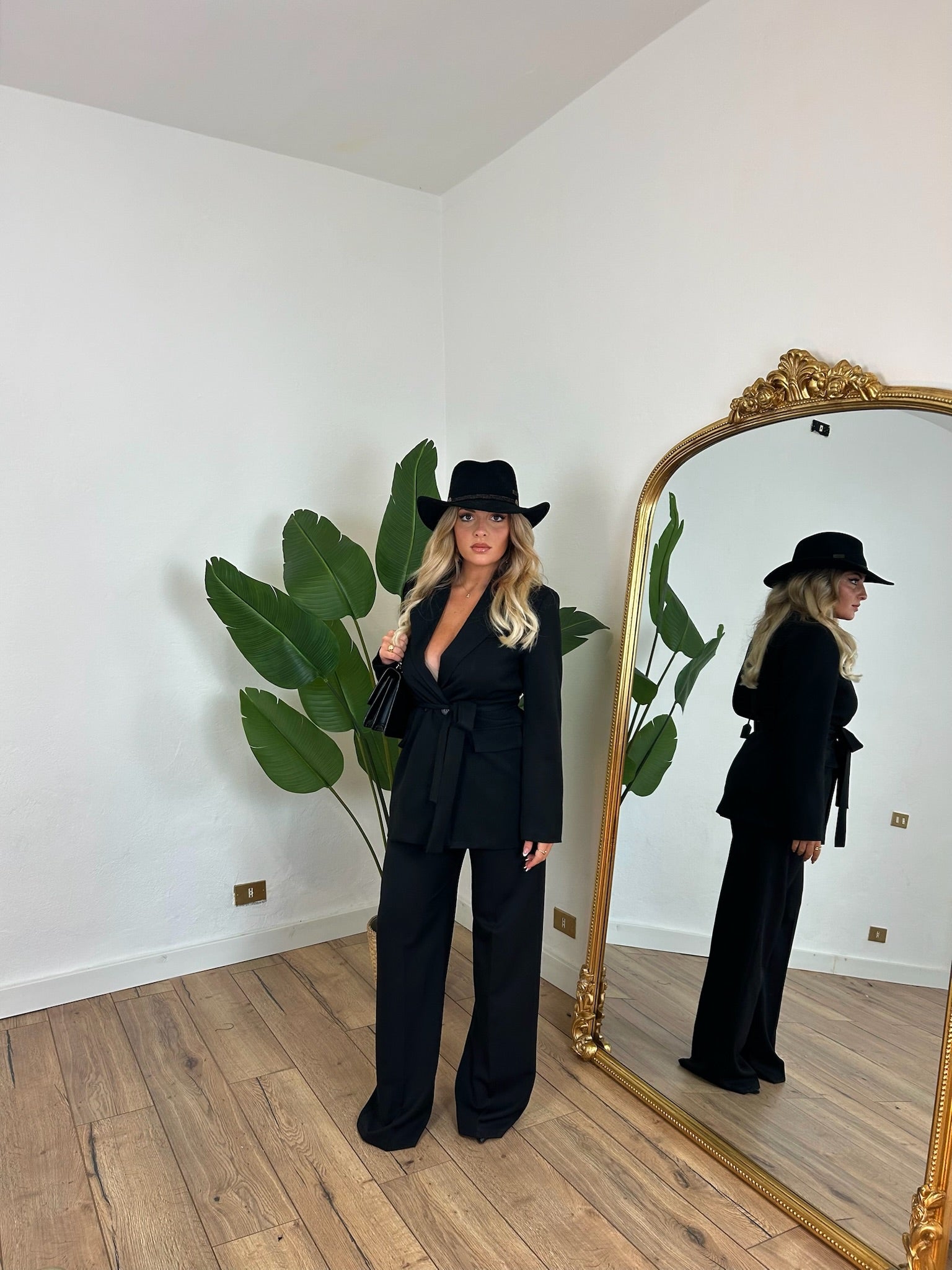 Completo nero composto da giacca oversize con spalline imbottite e cintura rimovibile e pantalone con vita elasticizzata adattabile a tutte le taglie.