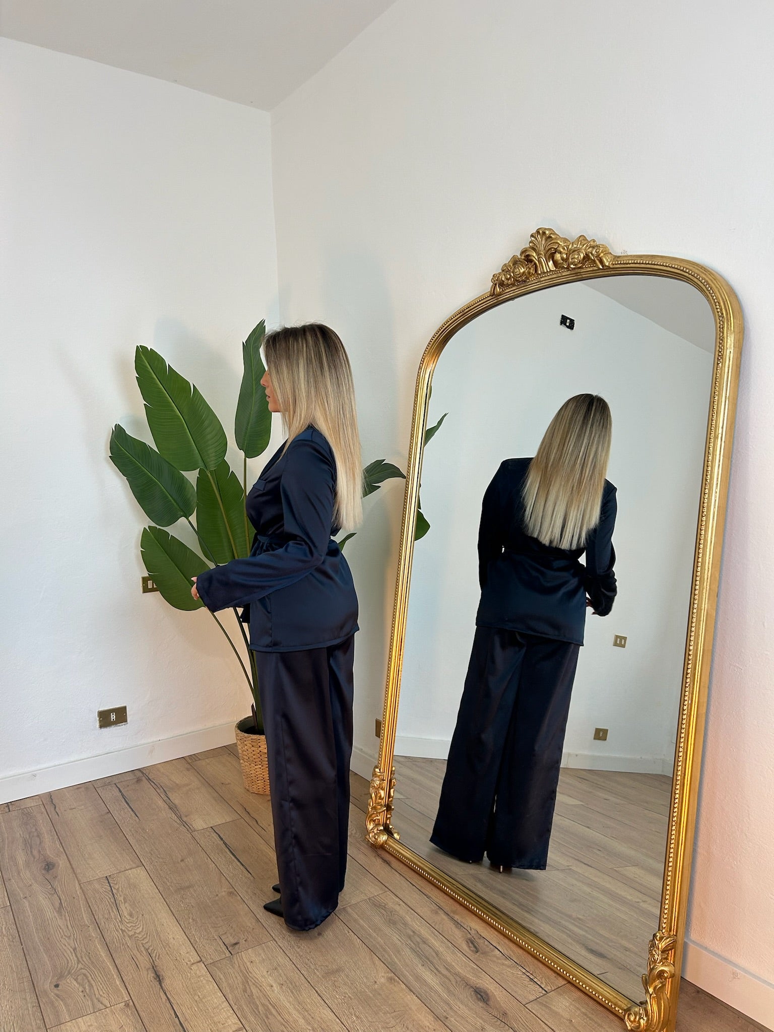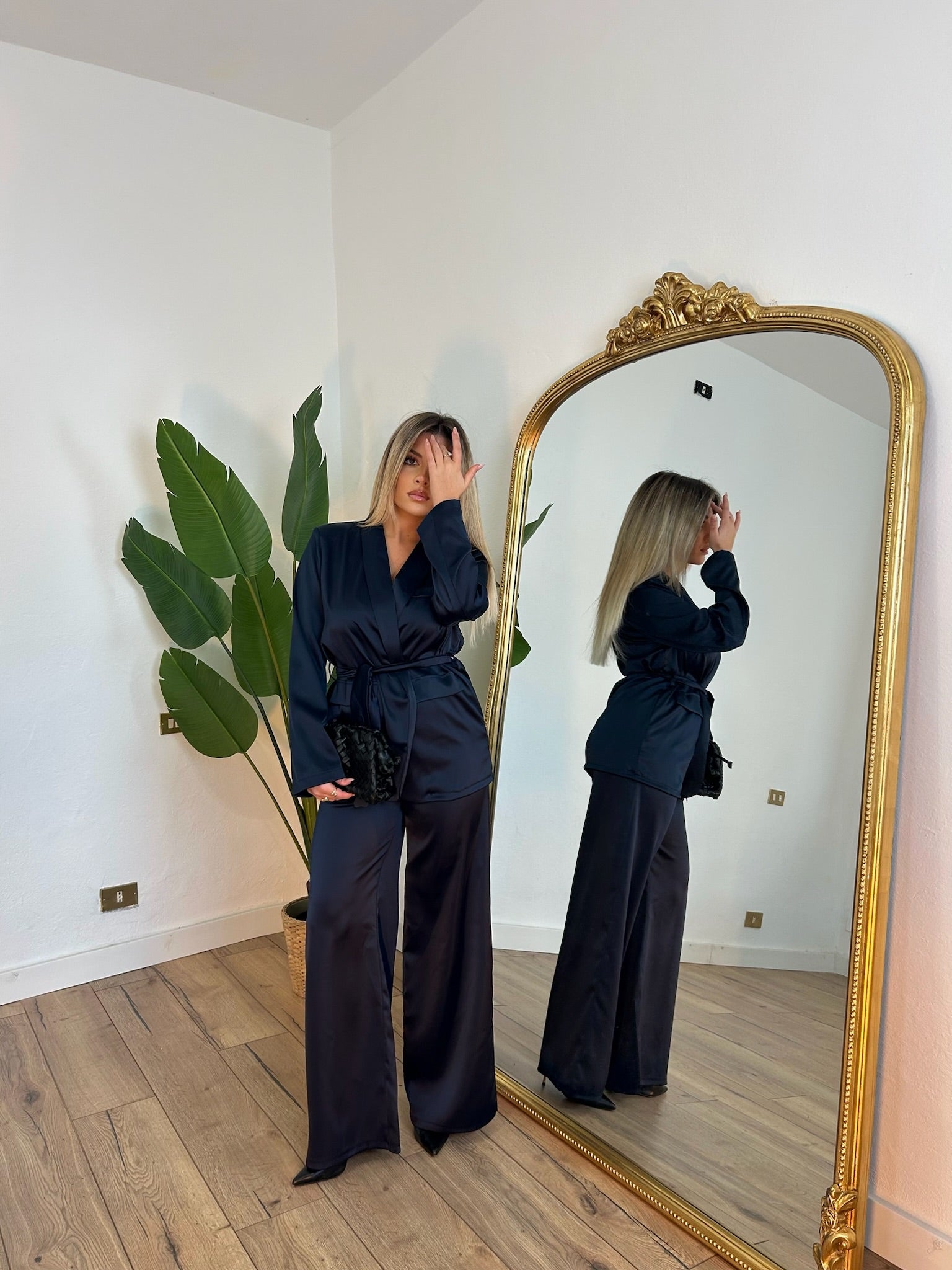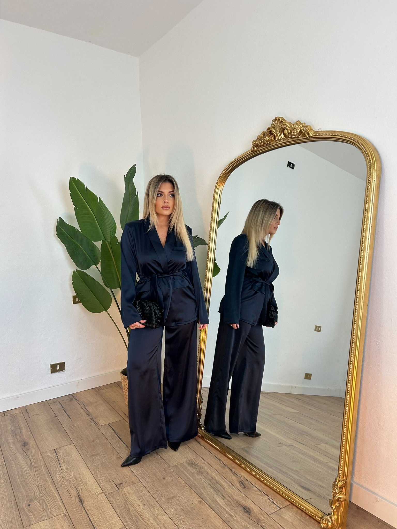 Completo satinato blu composto da giacca morbida con con spalline imbottite e cintura rimovibile e pantalone regolabile tramite cinturino in vita.