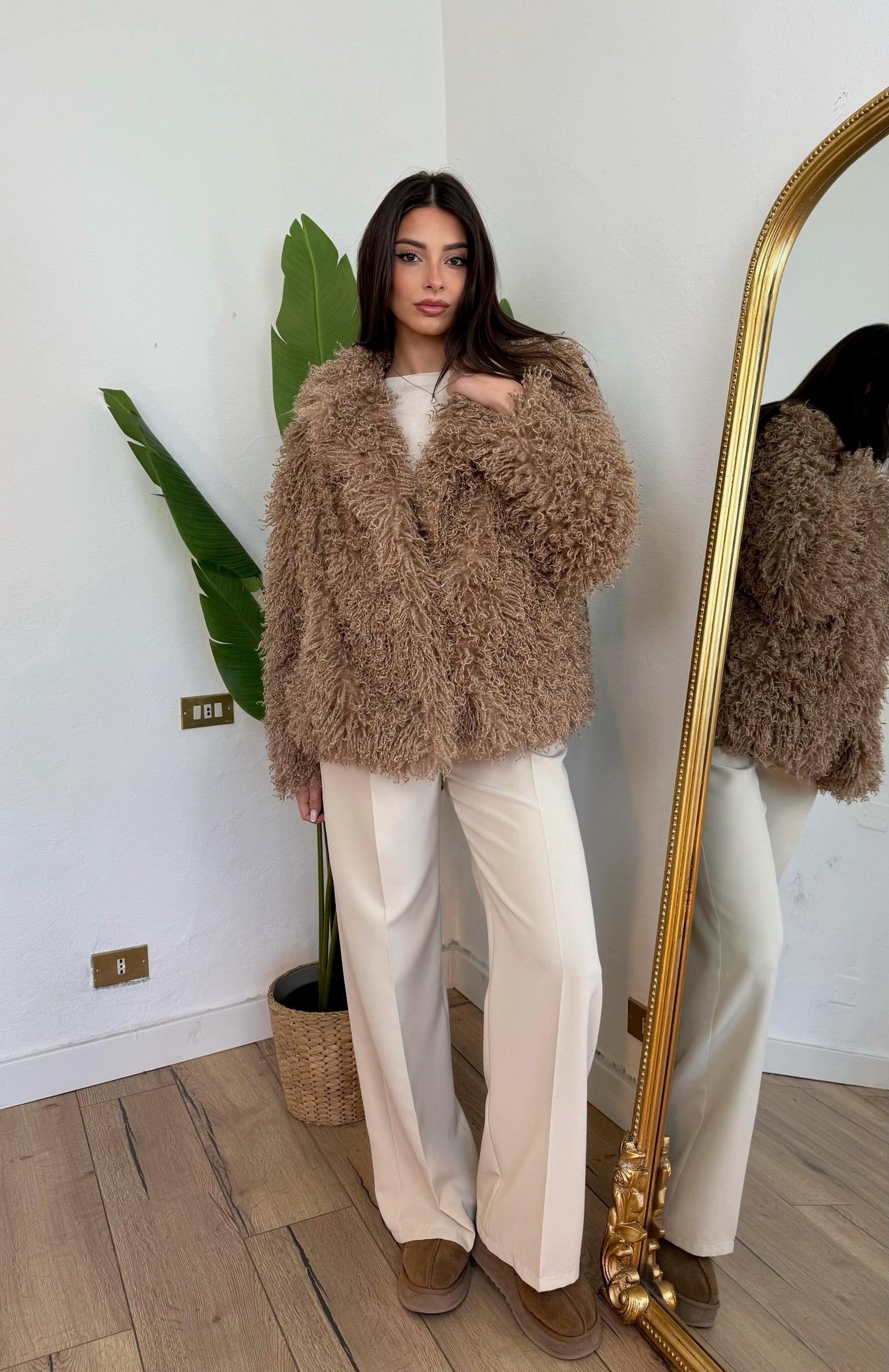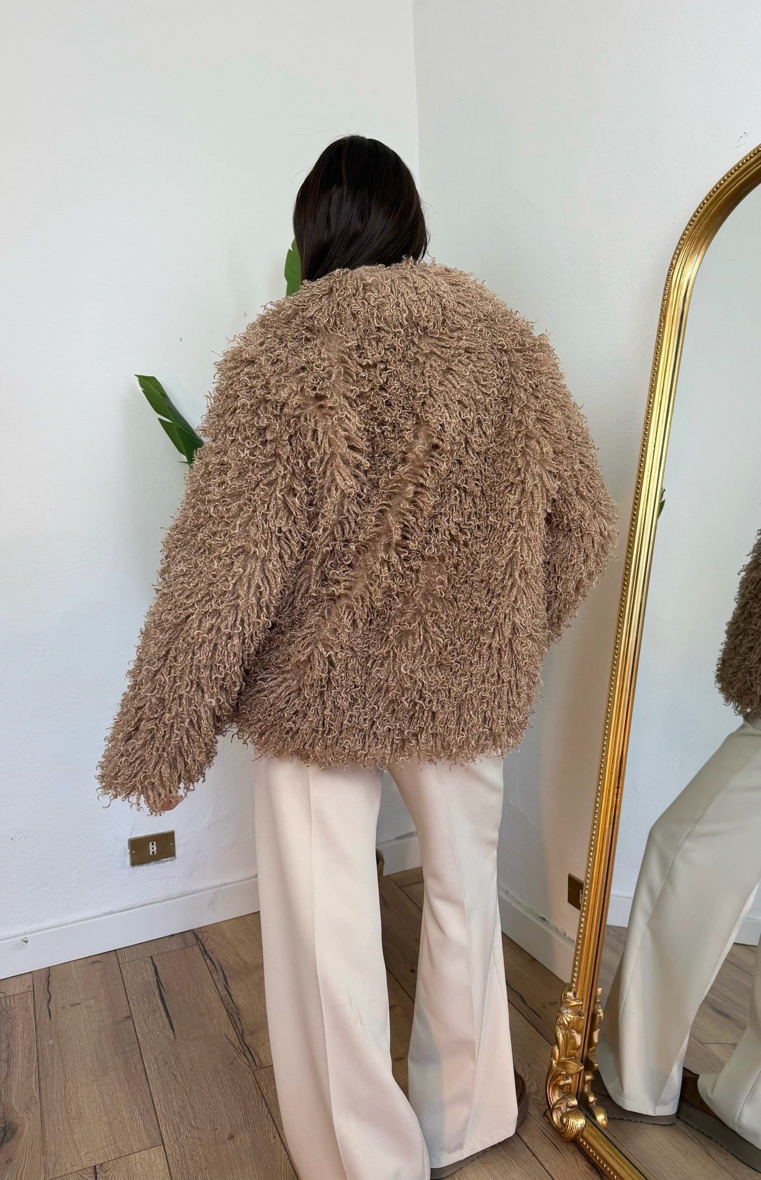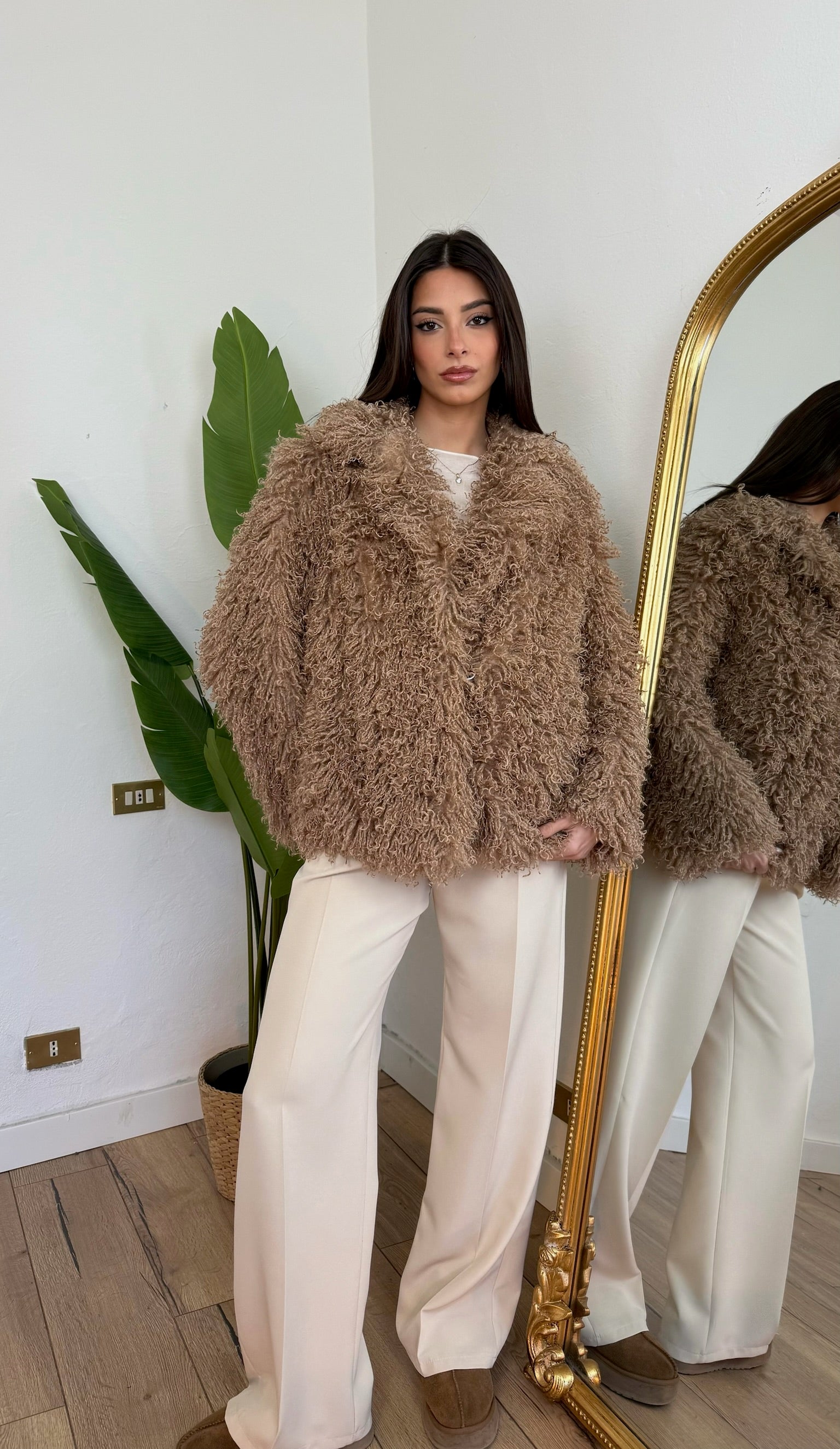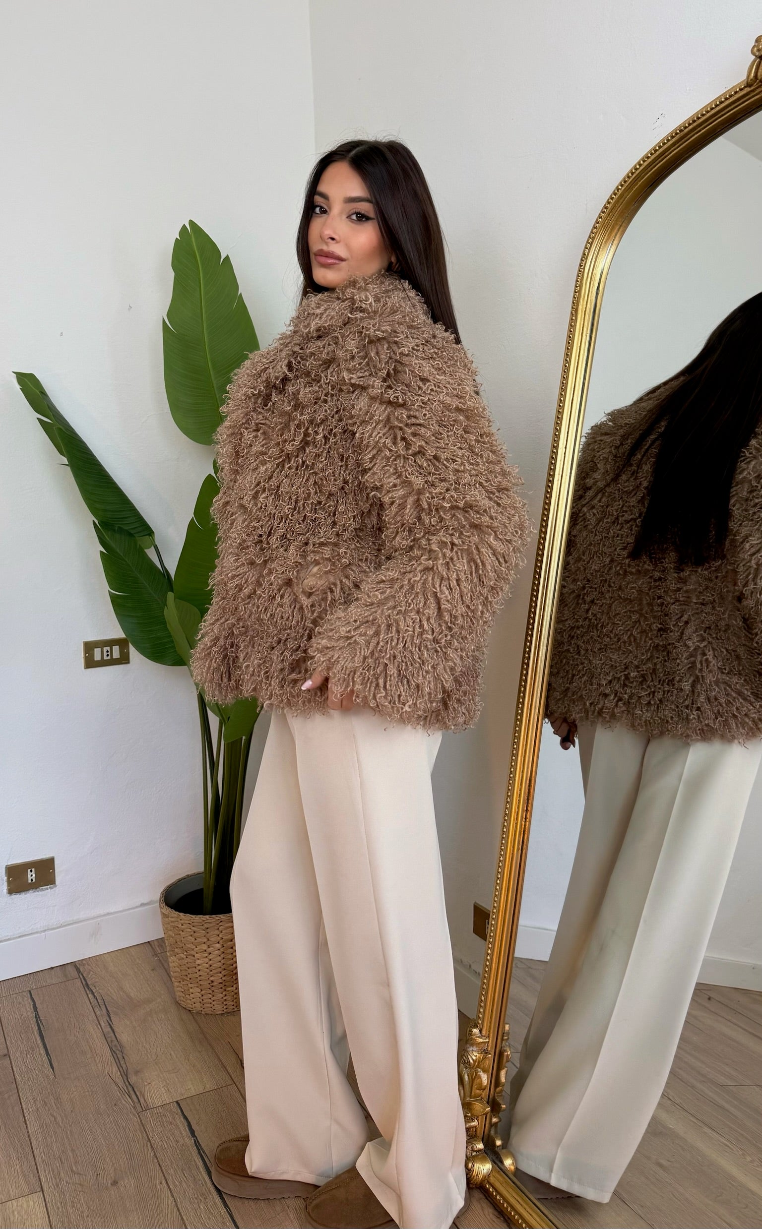 Eco pelliccia in Mongolia, con tasche e chiusura frontale con gaccetti.