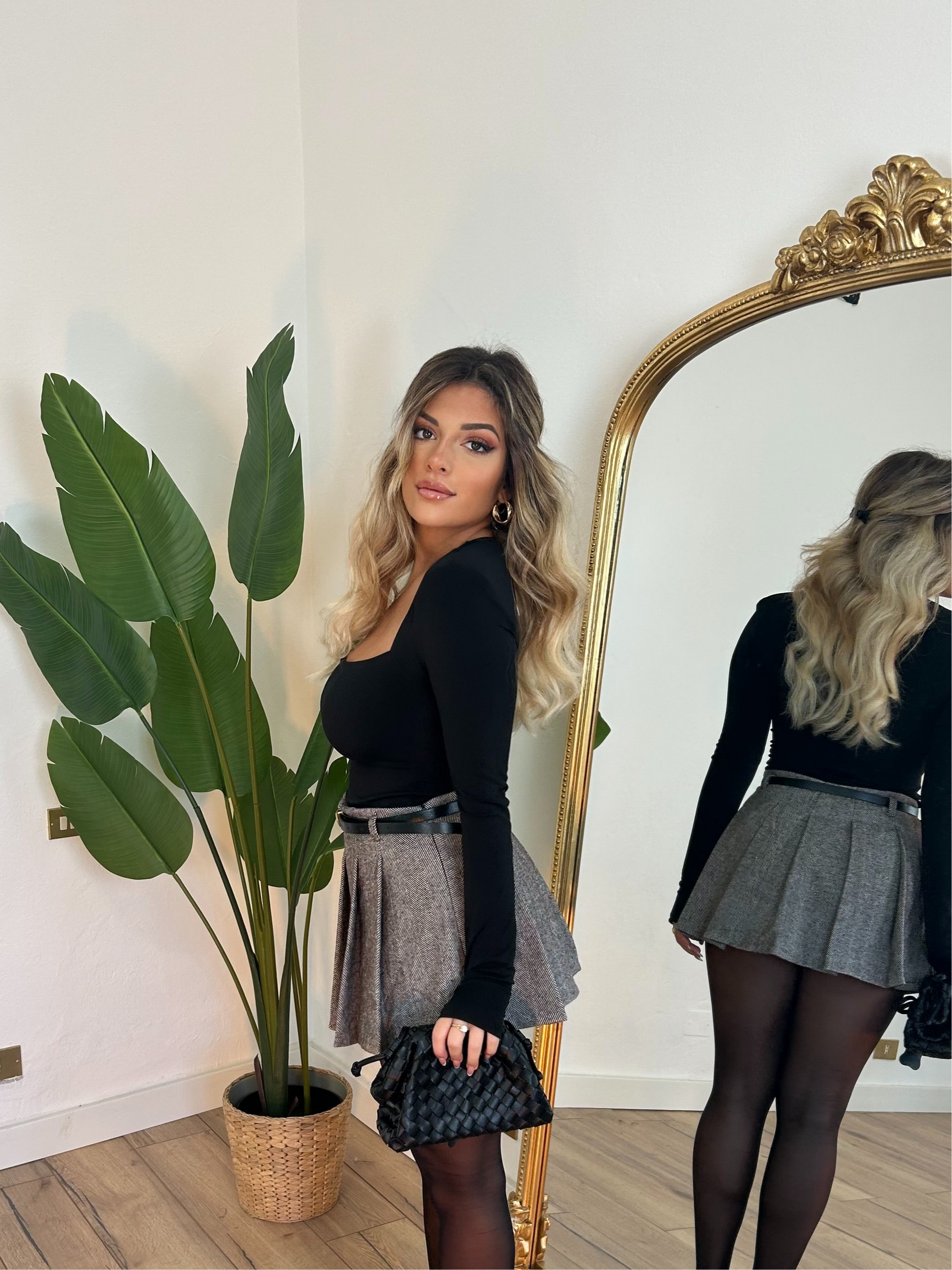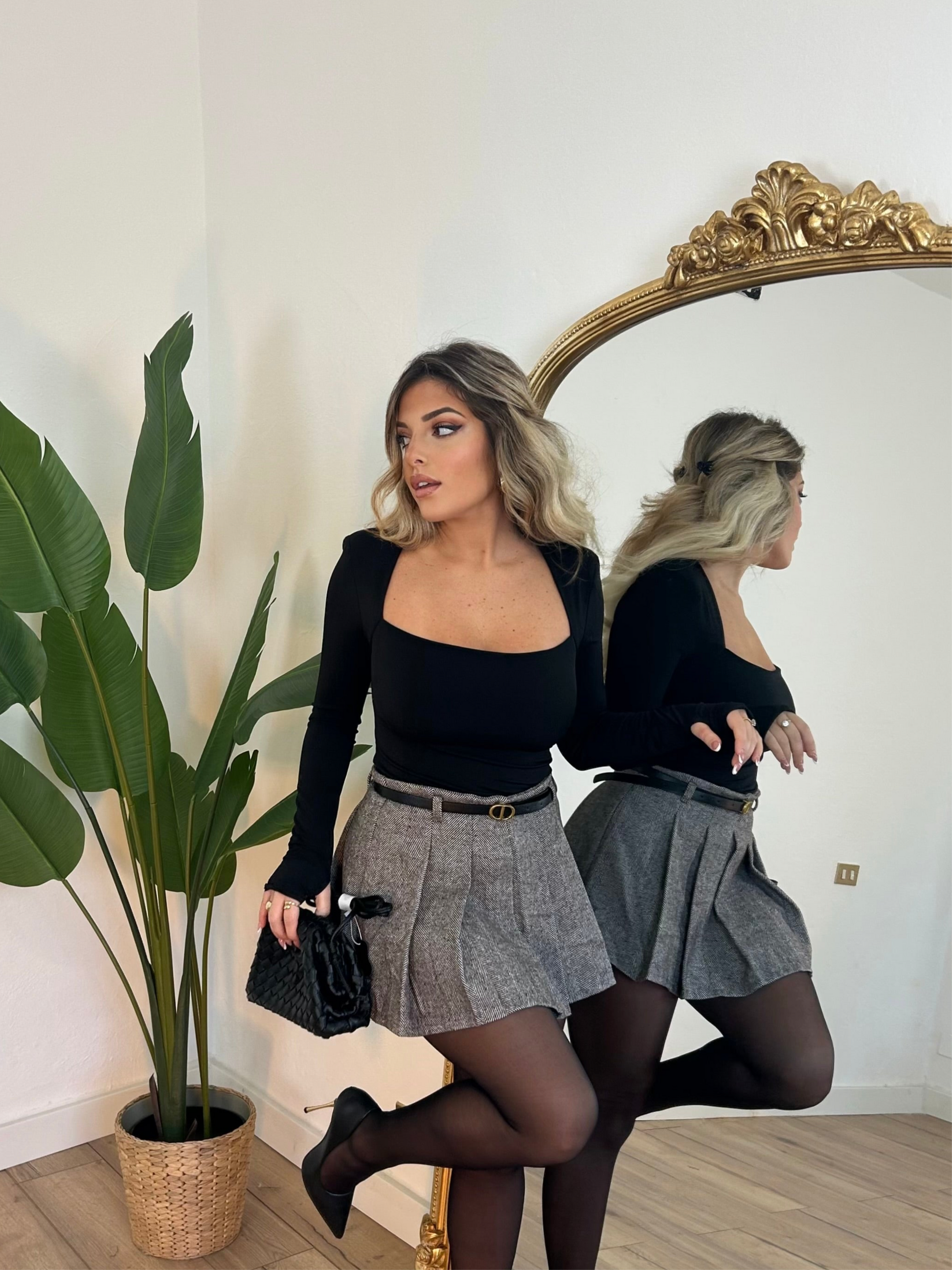 Gonna pantaloncino plissettata grigia con cinturina nera rimovibile.