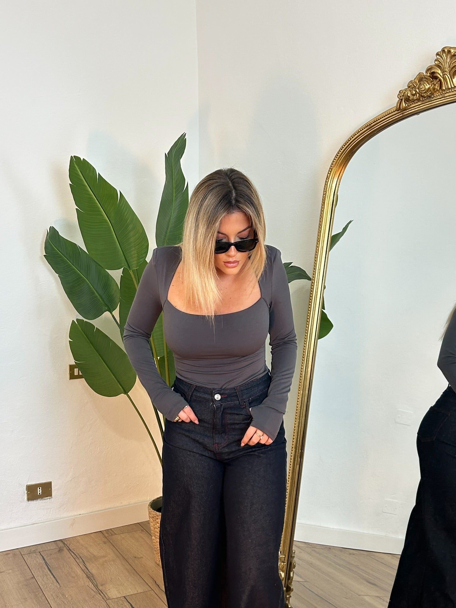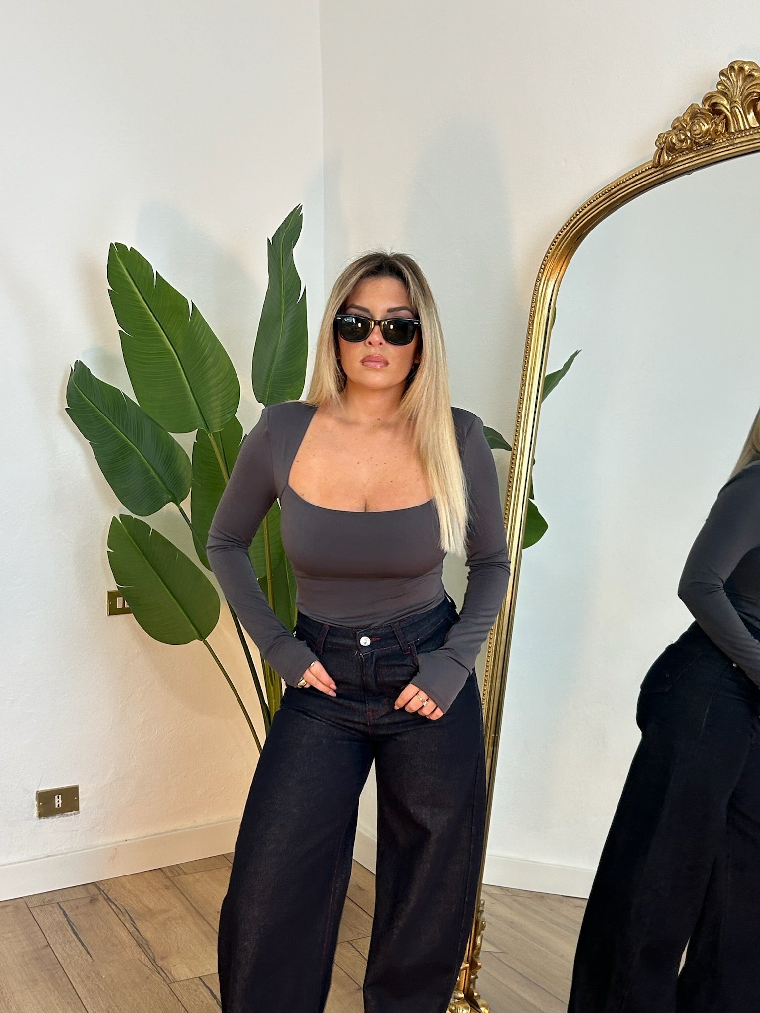 Maglia maniche lunghe con spalline imbottite, scollo rettangolare e manicotti.