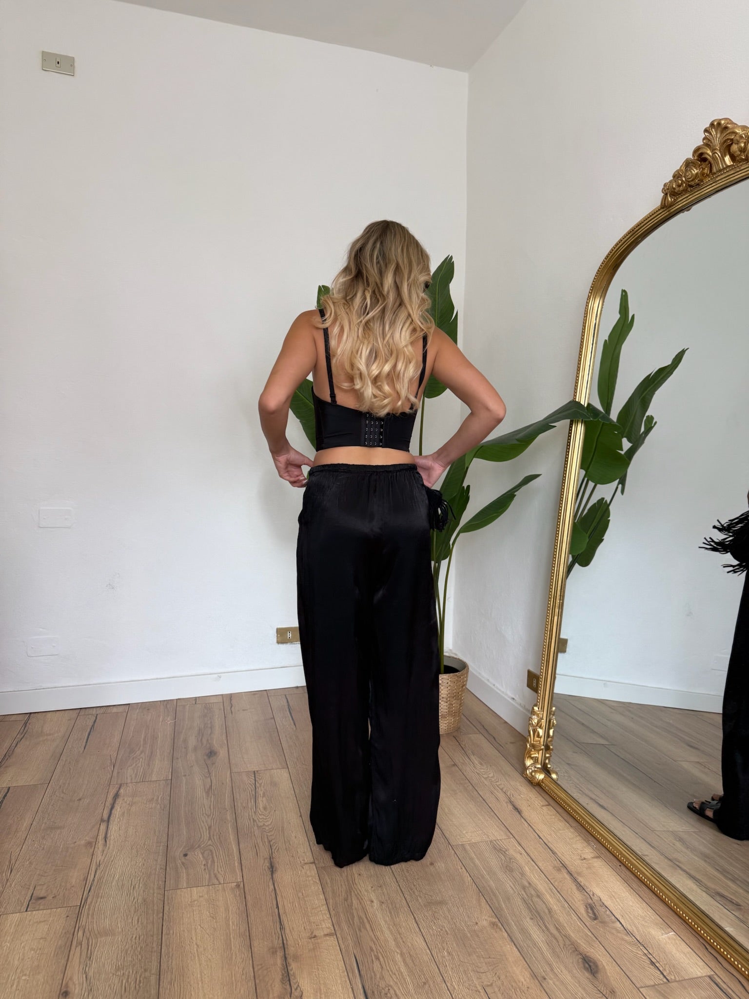 Pantalone lungo in raso con vita elasticizzata e regolabile con laccetti.