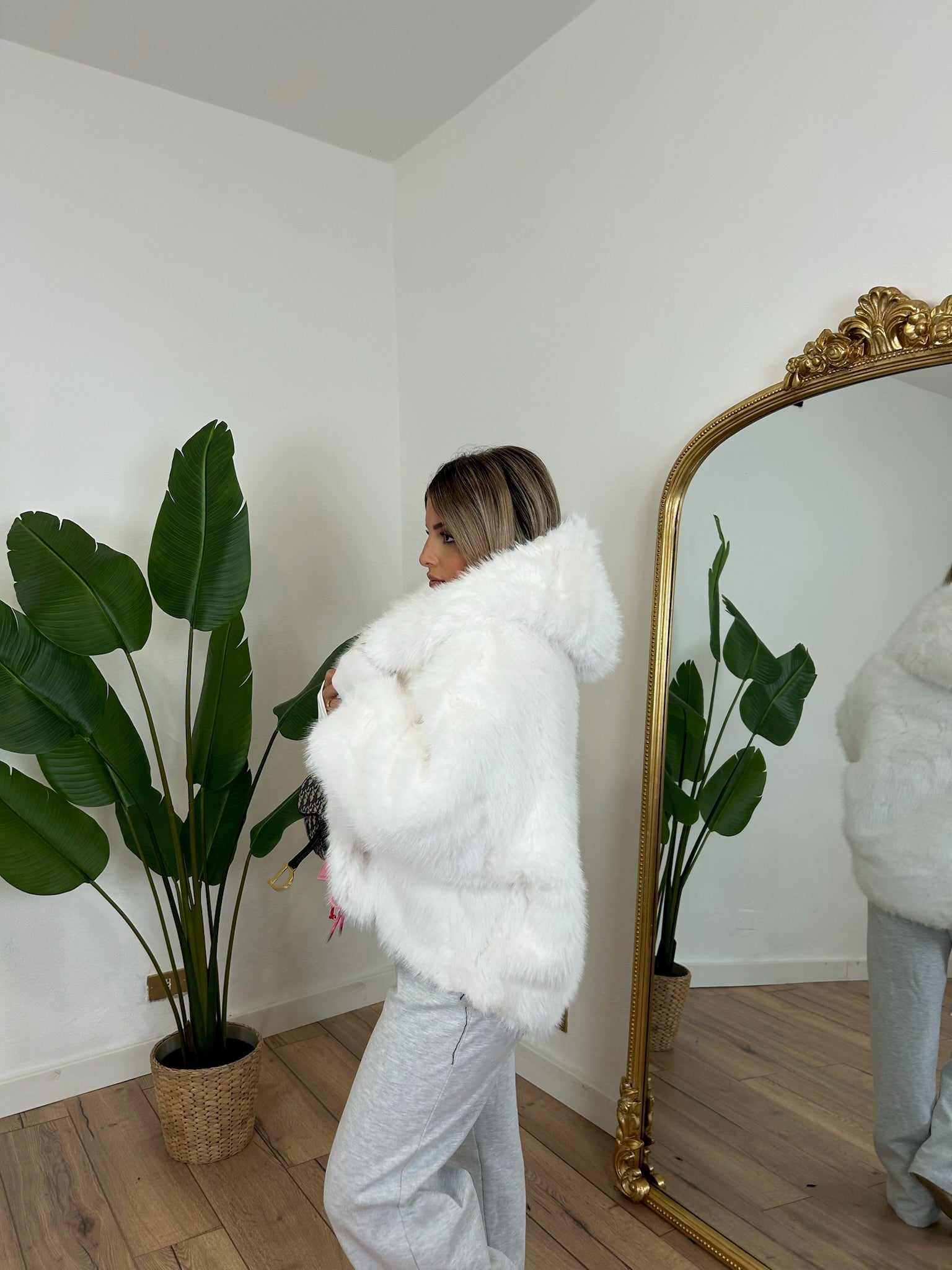 Pelliccia con chiusura davanti e cappuccio morbida e calda. Altezza modella 1,63 m.