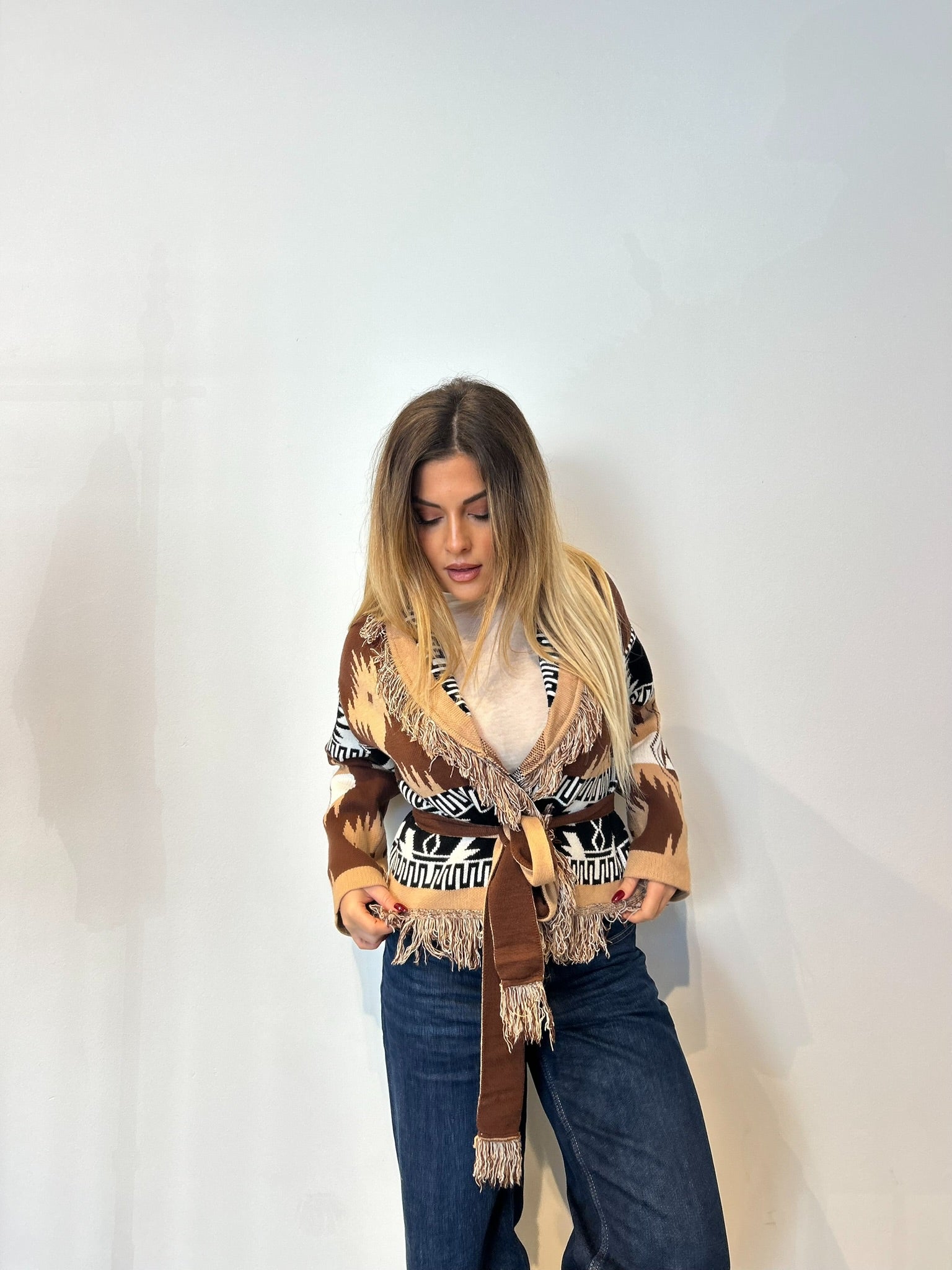 Cardigan in maglia elasticizzata con cintura annodabile, lunghezza fino a sotto i fianchi.