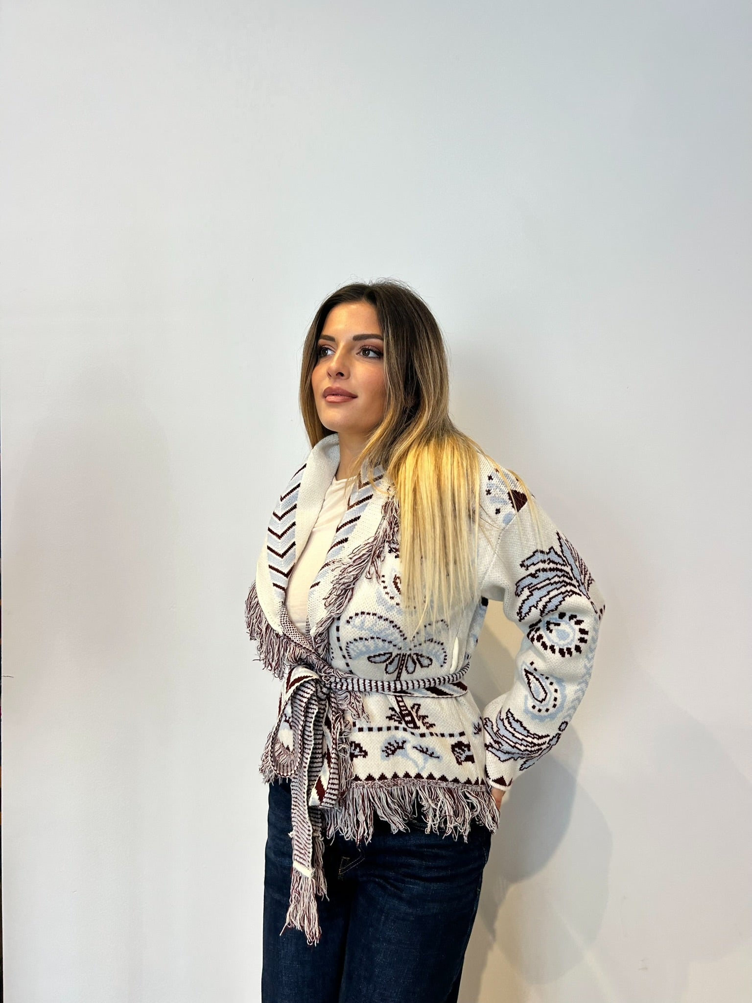 Cardigan in maglia elasticizzata con cintura annodabile, lunghezza fino a sotto i fianchi.