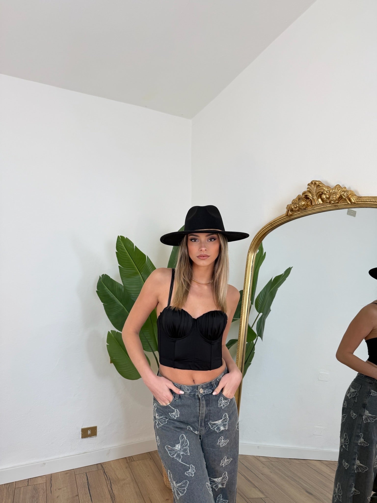 Top corsetto nero con spalline regolabili e gancetti sulla schiena adattabile a più taglie.